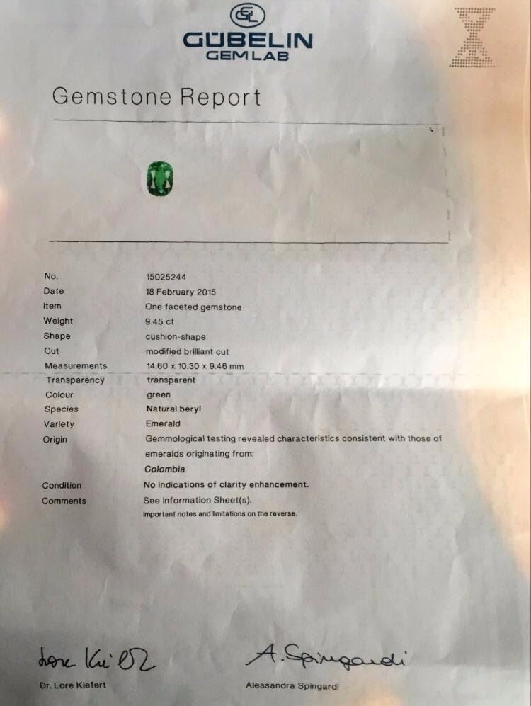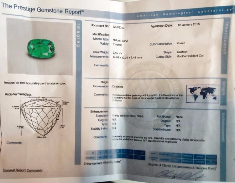 Natural Columbian Emerald 9.45 Carats - FL/VVS Quality....top color..no treatment in any way (Note- there is no oil treatment also...completely untreated).......certified by SSEF, Gubelin AGL certified