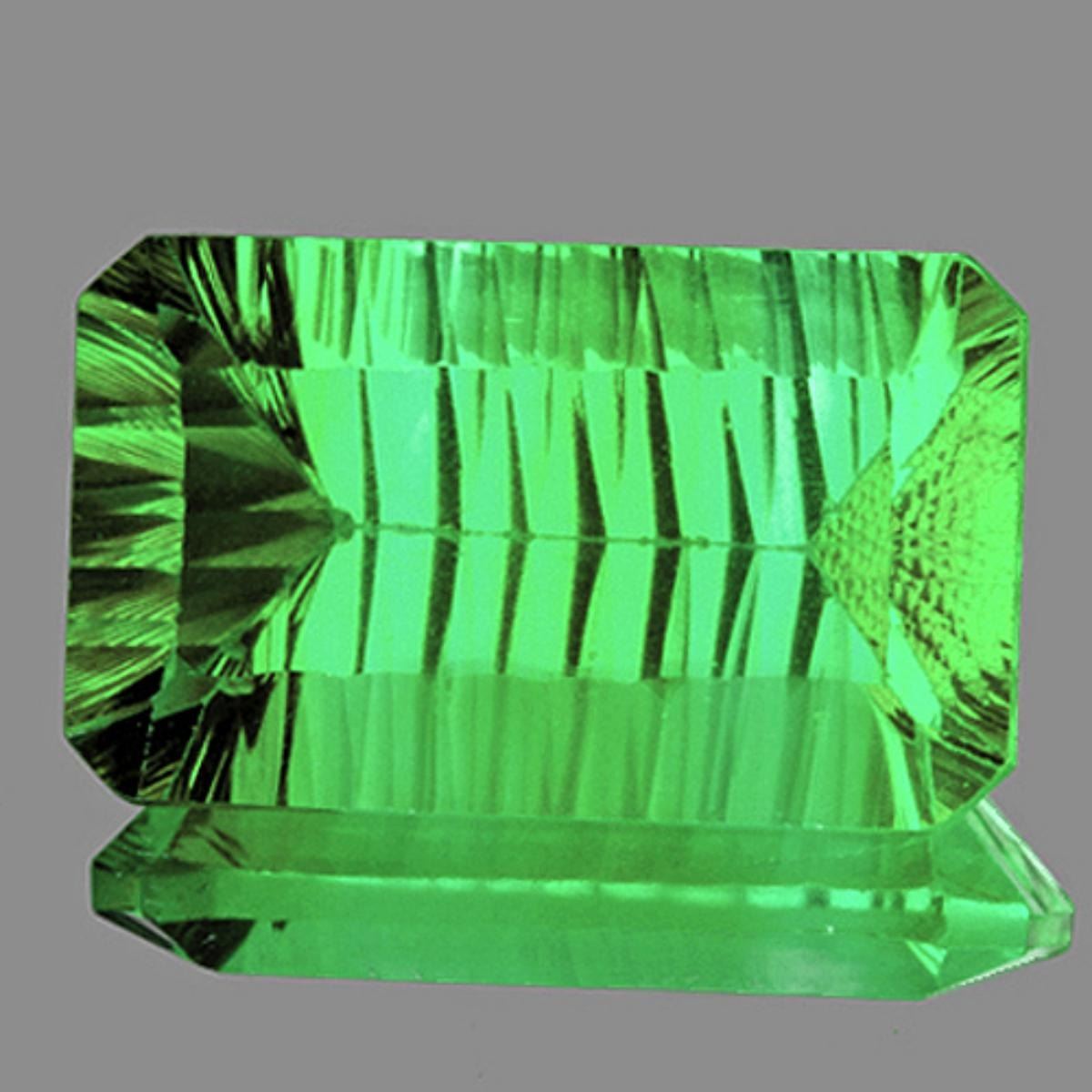 Natural Fluorite WEIGHT : 49.96 cts SHAPE : Rectangle (Concave Cut) SIZE ( L x W x D ) : 28.00 x 16.86 12.98 mm QUANTITY : 1 piece COLOR : Emerald Green CLARITY : IF-VVS1 (BEST QUALITY) ORIGIN : Brazil; HARDNESS : 4-5 LUSTER : Excellent!!! TREATMENT : 100% Natural Unheated