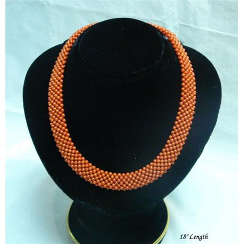 This necklace is made of a series of coral beads in a double-side net pattern. The color is in orange with a bit of variation. It is a beauty that shows the craftsmanship of the maker and the natural color of the coral. 46g coral weight. Coral Beads: 0.3cm @
