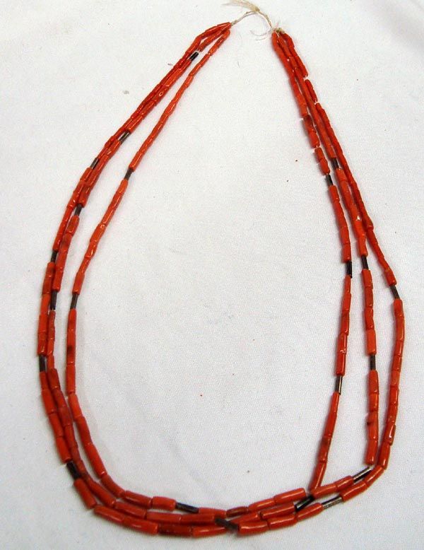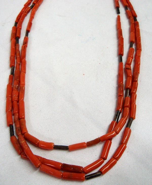 Natural Coral Three Strand Necklace. The coral tube beads measure approximately 3/8'' length with silver spacers. Over the head style, strung on string. The necklace measures 28''.