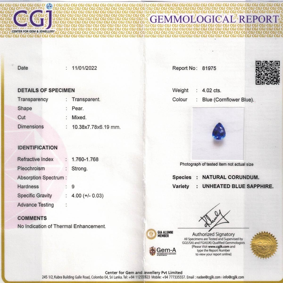 Natural Cornflower Blue Sapphire 4.02 Cts - Certified ....Pear Shape ; Size 10.38 x 7.78 x 6.19 MM; Clarity - Eye Clean; Origin - Sri Lanka;