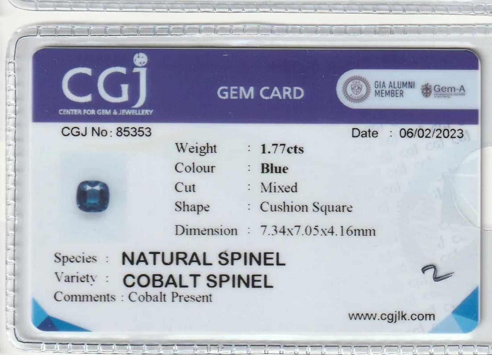 Natural Cushion Cobalt Blue Spinel 1.77 Cts- Untreated; Size - 7.34 x 7.05 x 4.16 MM; Eye Clean; Completely untreated ; Origin - Vietnam;