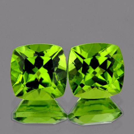 Natural Peridot; SHAPE : Cushion; SIZE ( L x W x D ) : 7.00 mm; QUANTITY : 2 pieces ( Perfectly Matched Pair ) COLOR : Green Best Color ; CLARITY : IF-VVS1 (BEST QUALITY) ORIGIN : PAKISTAN; HARDNESS : 7; LUSTER : Excellent!!! TREATMENT : UNHeated