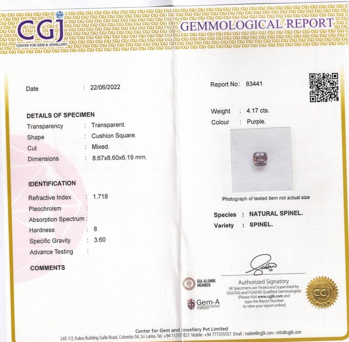 Natural Cushion Purple Spinel 4.17 Cts - Certified ....size - 8.67 x 8.60 MM; Clarity - VS ; Origin - Ceylone/Sri Lanka....Certified