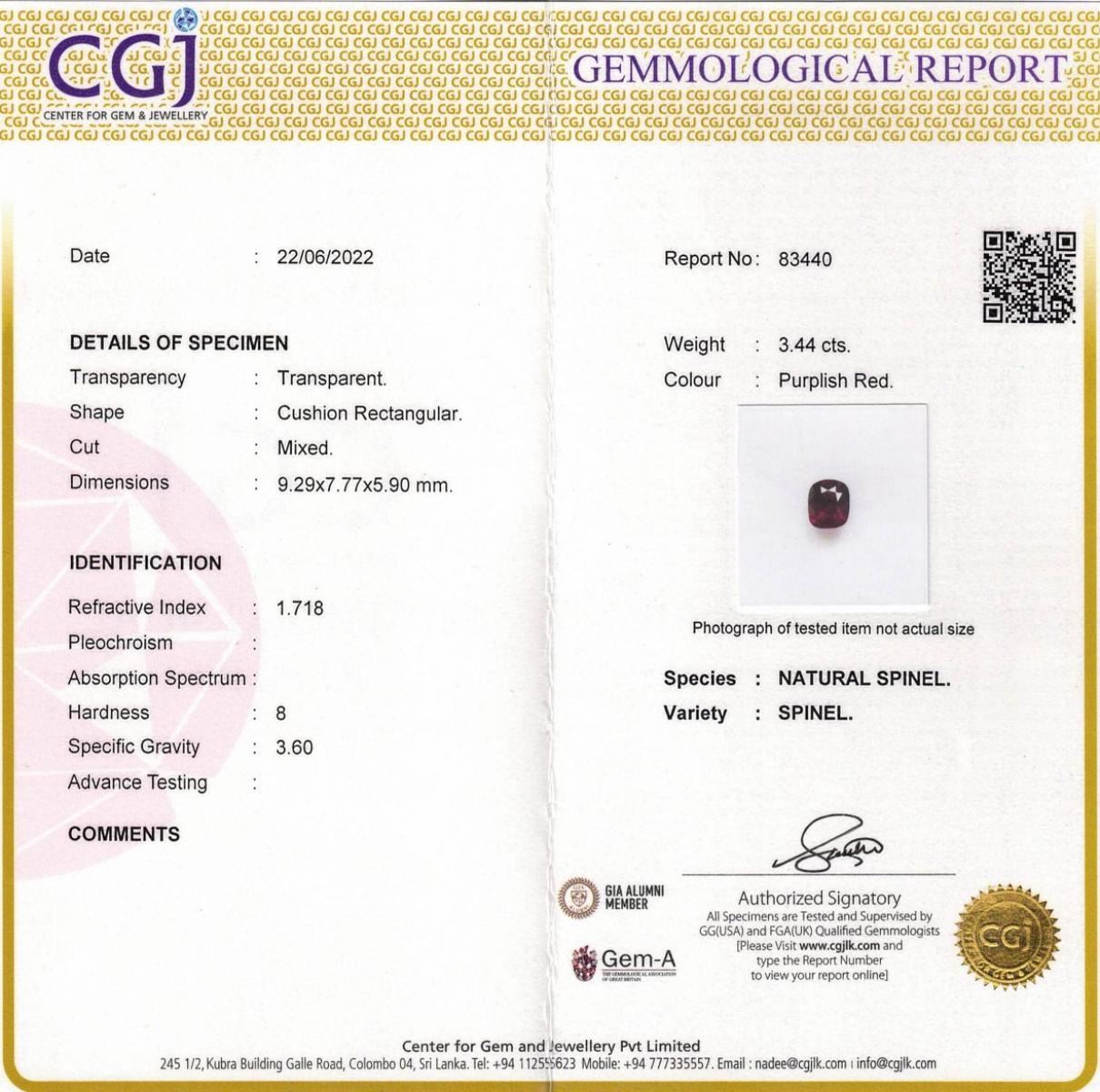 Natural Cushion Purplish/Red Spinel 3.44 Cts - Certified ....size - 9.29 x 7.77 x 5.90 MM; Clarity - VS/ ; Origin - Ceylone/Sri Lanka