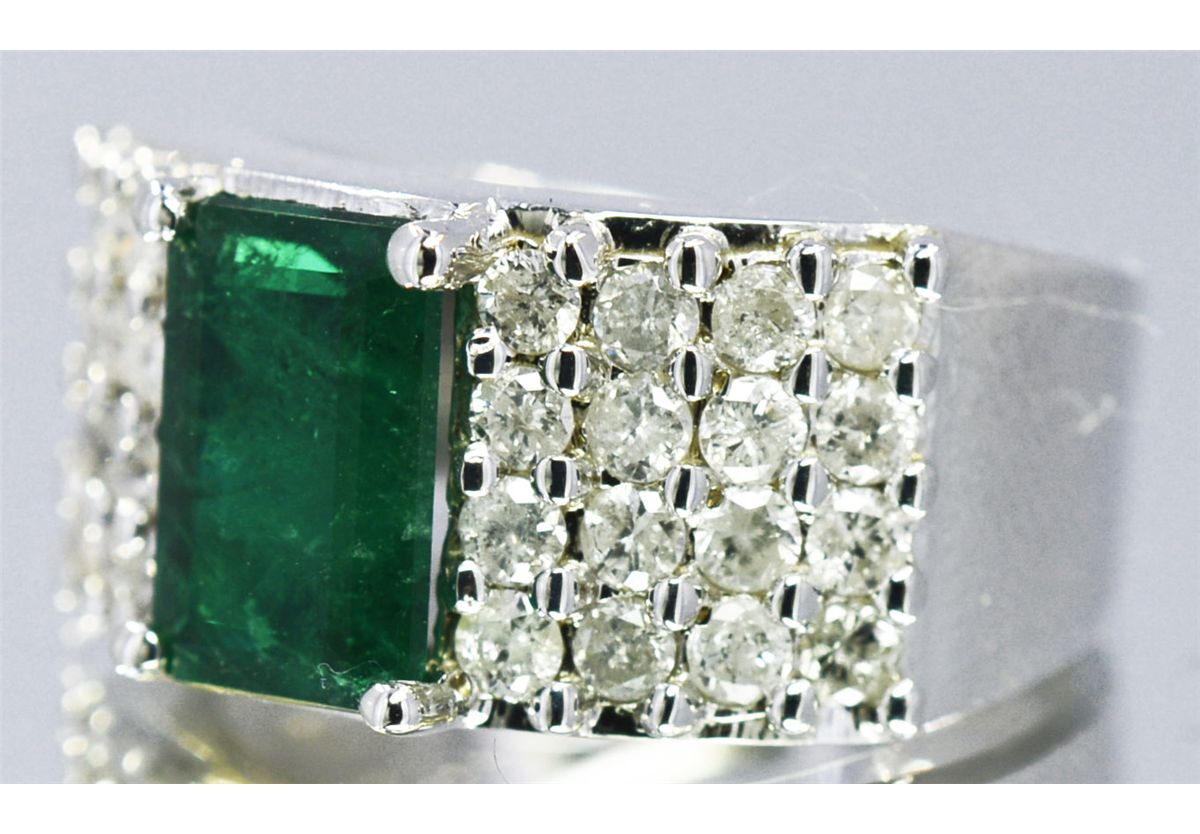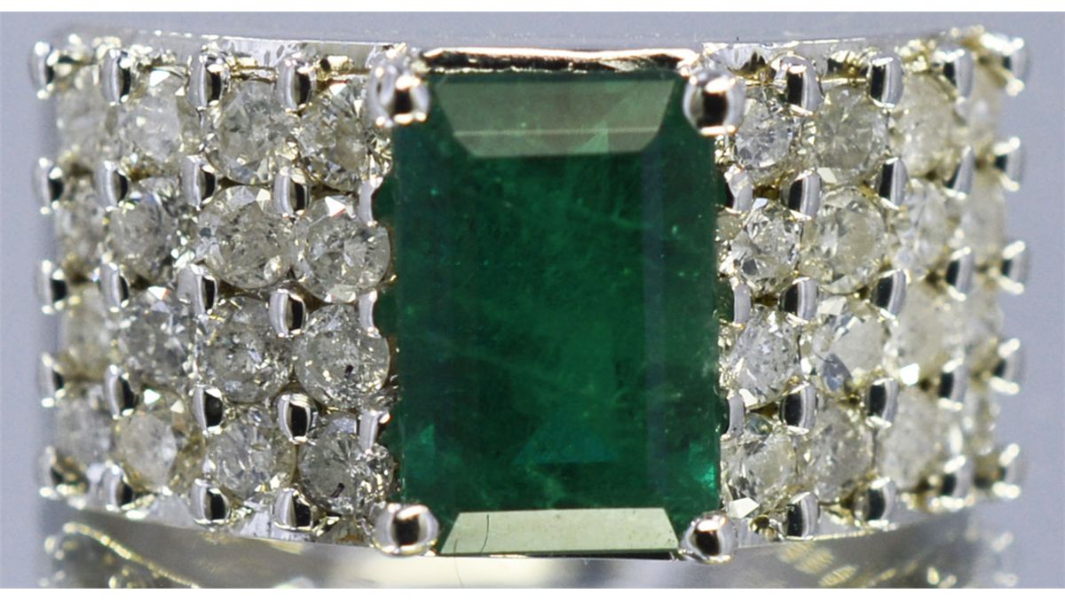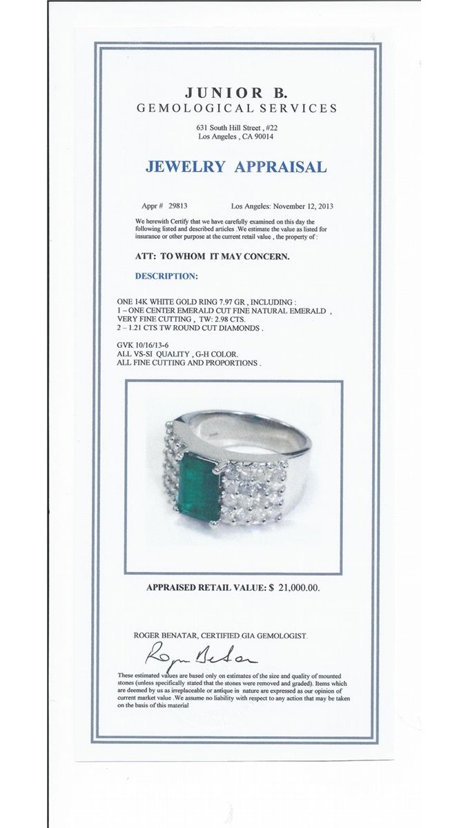 14kt White Gold 7.97 Approx grams including, 2.98ct Emerald Excellent Emerald cut Deep Green 1.21cttw Round Diamond G-H color VS-SI clarity, size 7.25, Appraised Retail Value$21,000.00