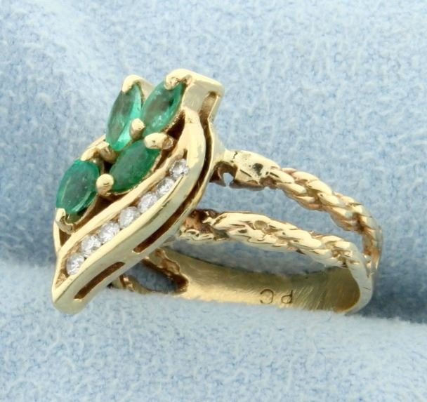 In 10K yellow gold the ring contains four 4mm long natural marquise emeralds and seven .01ct diamonds with great color and cut! Size 3 2.9g