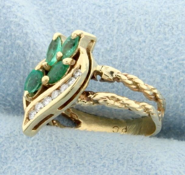 In 10K yellow gold the ring contains four 4mm long natural marquise emeralds and seven .01ct diamonds with great color and cut! Size 3 2.9g