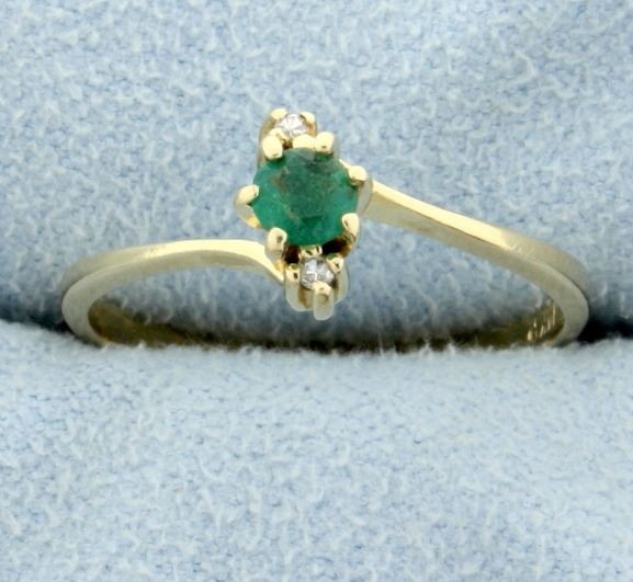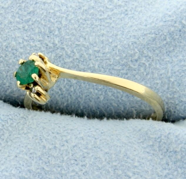 In 14K yellow gold there is a .2ct natural round emerald and two .01ct diamonds. Size 7 1.6g
