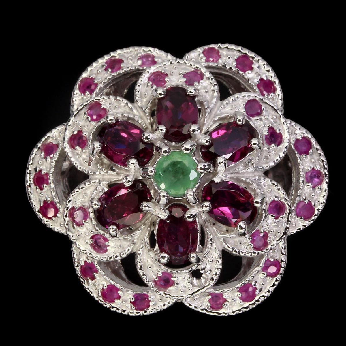 925 STERLING SILVER;PLATE14K WHITE GOLD;RING SIZE(resizeable)7.5;MAIN STONEEMERALDOTHER GEMSRHODOLITE GARNET,RUBYTOTAL WEIGHT65.54 CT (TOTAL WEIGHT OF SILVER + STONE)DIMENSION* STONE 2.0 TO 6.0 X 4.0 MM. * FACE RING 29.0 X 26.0 MM.MAIN STONE SHAPEROUND CUTMAIN STONE COLORTOP RICH GREENCLARITY/GRADETRANSPARENTLUSTERGORGEOUSTREATMENTUNHEATEDORIGINBRAZILHARDNESS7.5 - 8.0