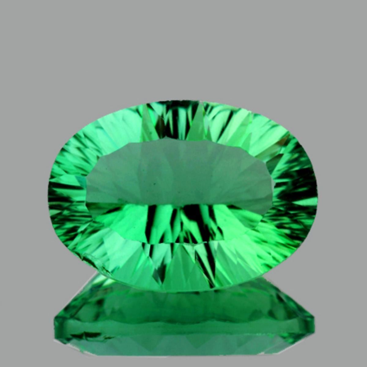 Natural Fluorite WEIGHT : 14.20cts; SHAPE : Oval (Concave Cut) SIZE ( L x W x D ) : 18.84 x 13.32 x 8.72 mm; QUANTITY : 1 piece ; COLOR : Emerald Green ; CLARITY : Flawless-VVS1 ; ORIGIN : Brazil; HARDNESS : 4-5 LUSTER : Excellent!!! TREATMENT : 100% Natural Unheated; Fluorite is made up of calcium fluoride and has a transparent or translucent appearance. Sometimes it can be a colorless crystal, but other times it can also be purple, blue, green, yellow, or pink, or other combinations of these colors. Fluorite is sometimes called fluorspar. The name is derived from the Latin word ‘fluo’, meaning to flow. It’s one of the most sought after and most collectible crystals in the world because of its luminosity and beauty. It has a soft and glassy appearance that is often very vibrant.........On a psychic level, Fluorite is a very protective crystal. It will help you know when there are external forces trying to control or manipulate you, and it can effectively shut down any kind of mental or psychic manipulation. This is a particularly useful crystal to have at work when you are surrounded by hostile or opposing forces. It’s also a powerful crystal to ward off negative energies that threaten your personal relationships. Fluorite can get rid of any electromagnetic fog that can attract or retain negative energies and make you feel psychically, emotionally, or mentally lethargic. It can purify your body and eliminate anything that’s causing it not to function perfectly. It can bring you calmness and relaxation, and it can relieve all your tensions and anxieties.....Fluorite can help you have more structure in your everyday life, making you physically, emotionally, and mentally prepared to overcome both small and big challenges. This crystal can help you declutter and get rid of the things, or even people, that are no longer healthy for you. It can support you in breaking away from rigid patterns of behavior or old ways of thinking. It has the ability to increase your intuition. It can increase your sense of confidence and strengthen your know-hows when it comes to life. If you’re feeling lost, confused, or empty, the uplifting energies of this crystal will reassure you that everything’s going to be alright
