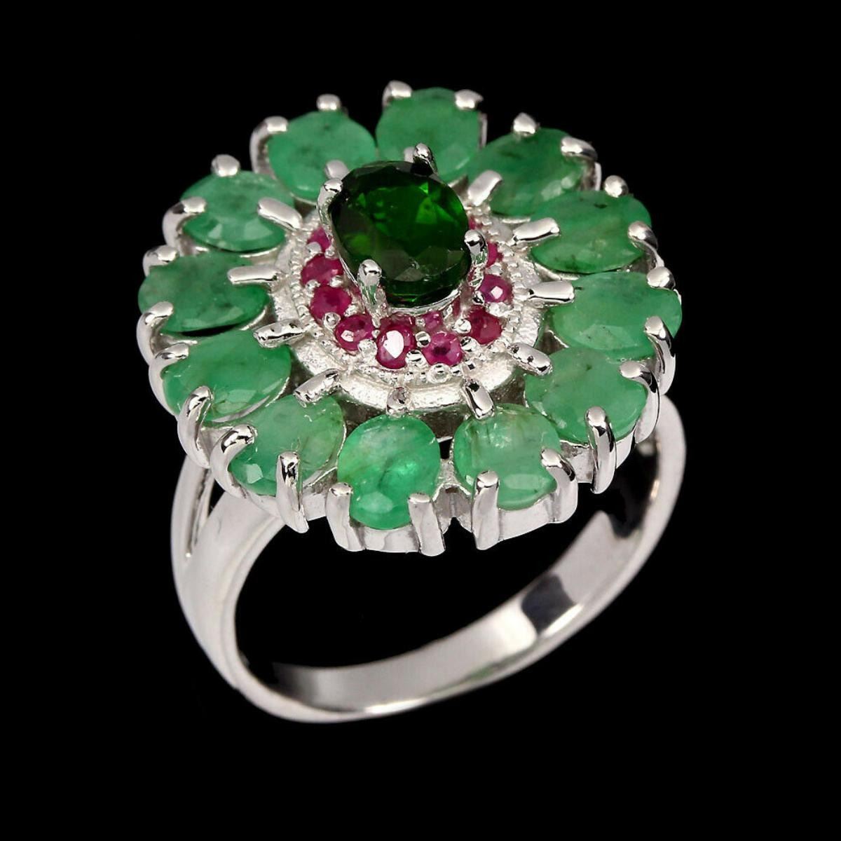 925 STERLING SILVER;PLATE-14K WHITE GOLD;RING SIZE8.5(resizeable)MAIN STONE-CHROME DIOPSIDE-OTHER GEMS-EMERALD,RUBY;TOTAL WEIGHT-40.25 CT (TOTAL WEIGHT OF SILVER + STONE)DIMENSION* STONE 1.5 TO 6.0 X 4.0 MM. * FACE RING 23.0 X 20.0 MM.MAIN STONE SHAPEOVAL CUT;MAIN STONE COLORTOP RICH GREEN;CLARITY/GRADEIF TO VVS;LUSTERGORGEOUS;TREATMENTUNHEATED;ORIGINRUSSIA & Zambia;HARDNESS5.0 - 9.0;