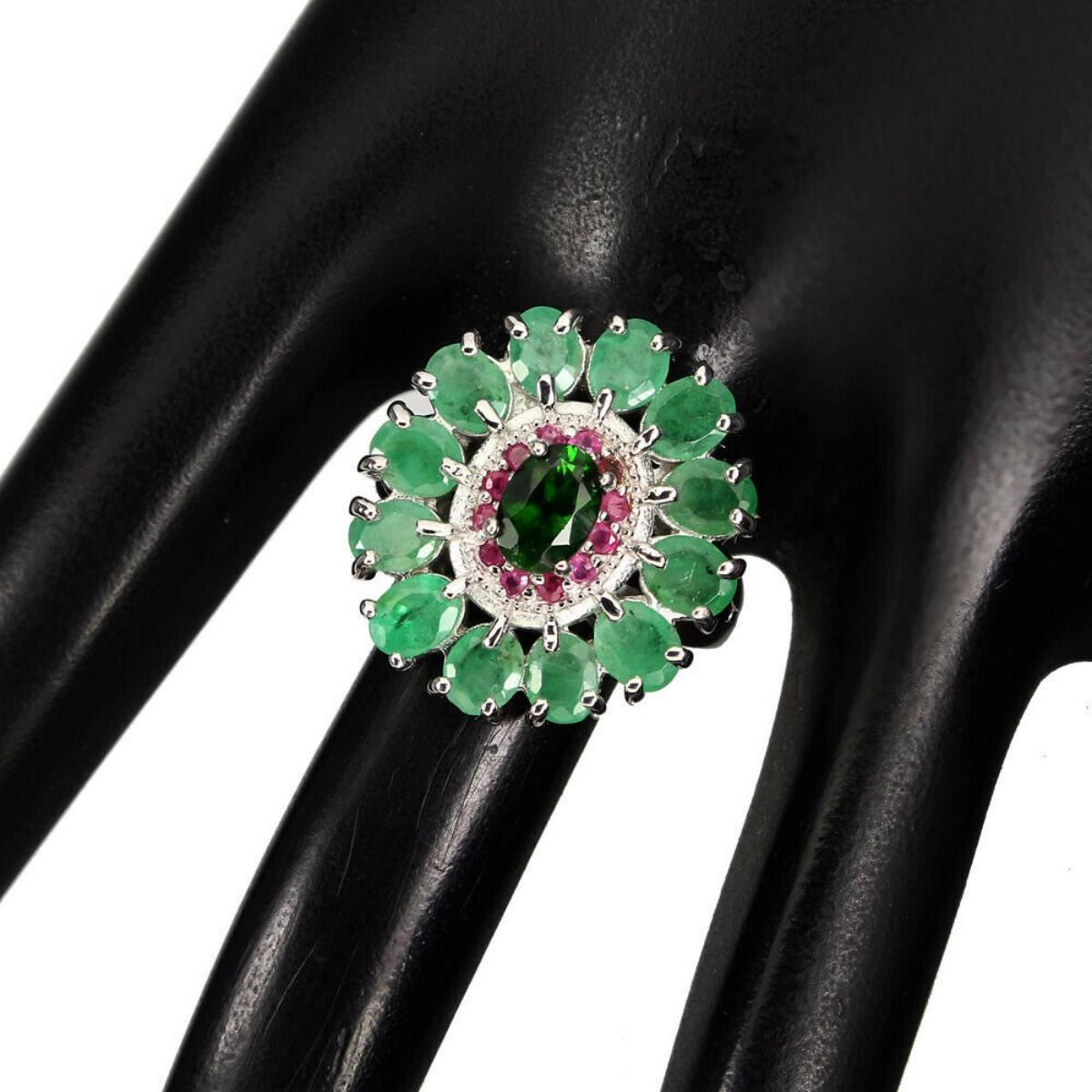 925 STERLING SILVER;PLATE-14K WHITE GOLD;RING SIZE8.5(resizeable)MAIN STONE-CHROME DIOPSIDE-OTHER GEMS-EMERALD,RUBY;TOTAL WEIGHT-40.25 CT (TOTAL WEIGHT OF SILVER + STONE)DIMENSION* STONE 1.5 TO 6.0 X 4.0 MM. * FACE RING 23.0 X 20.0 MM.MAIN STONE SHAPEOVAL CUT;MAIN STONE COLORTOP RICH GREEN;CLARITY/GRADEIF TO VVS;LUSTERGORGEOUS;TREATMENTUNHEATED;ORIGINRUSSIA & Zambia;HARDNESS5.0 - 9.0;