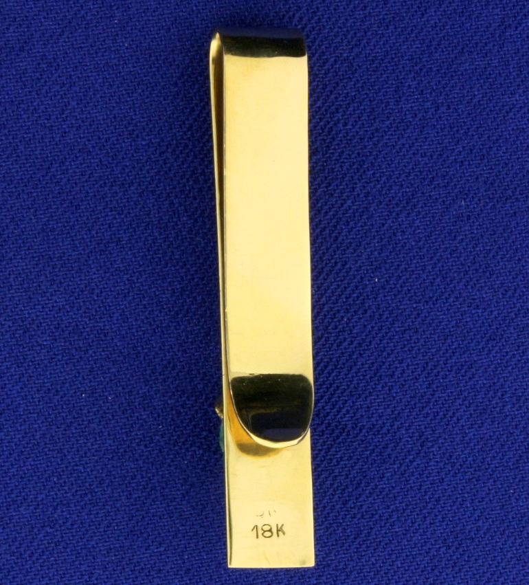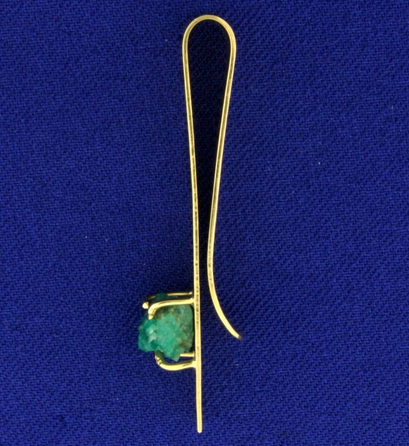 In 18k yellow gold. Contains a 6mm uncut high quality natural emerald with vivid green color and excellent clarity. 5/8" long. 5.1g.