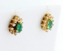 In 14K yellow gold these earrings contain two 5x3mm pear shaped natural emeralds with excellent color and clarity. They also have twenty high quality .01ct diamonds and come with friction backs. 1.6g