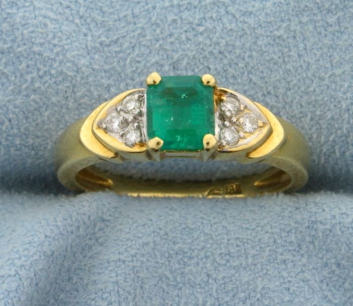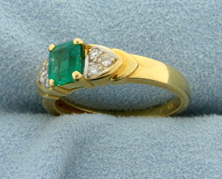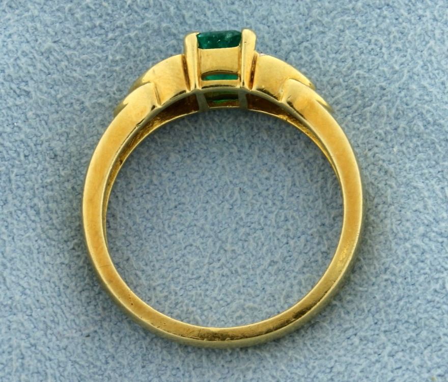 In 18k yellow gold, containing a high quality natural 2/3 ct Emerald with excellent clarity and color surrounded by six .01ct high quality diamonds. Size 7. 4.1g.