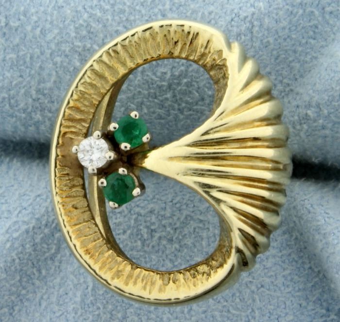In 14K yellow gold, it contains a high quality .07ct diamond, SI clarity/H color. Also contains two 2.5mm natural emeralds with excellent color and clarity. Size 6 1/4 7.5g