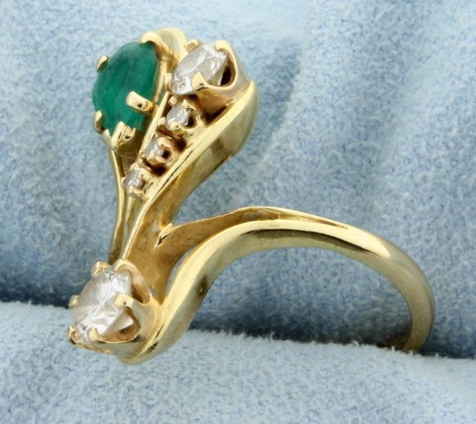 In 14K yellow gold, it contains one 1/2ct diamond, one 1/4ct diamond, one .03ct diamond, and two .02ct diamonds. All high quality VS clarity, G/H color. Also contains 7x5mm pear shaped natural emerald with great color and clarity. Size 7 1/2 5.7g