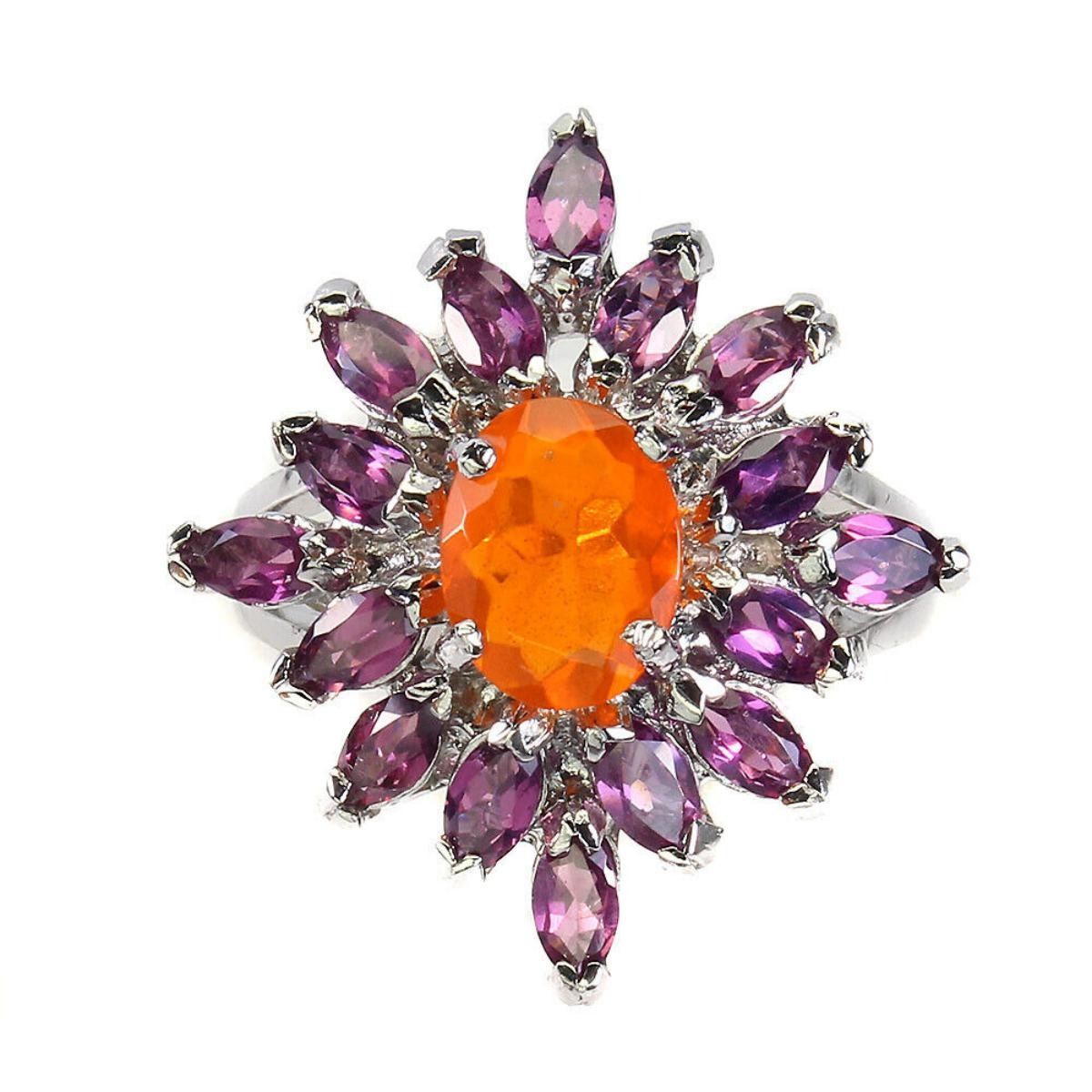 925 STERLING SILVER;PLATE-14K WHITE GOLD;RING SIZE/Resizeable-9;MAIN STONE-ORANGE OPAL;OTHER GEMS-RHODOLITE GARNET;TOTAL WEIGHT-7.09 GRAM (TOTAL WEIGHT OF SILVER + STONE)DIMENSION-* STONE 5.0 X 2.5 TO 9.0 X 7.0 MM.;* RING SIZE- 9.0;* FACE RING- 26.0 X 24.0 MM.;MAIN STONE SHAPE-OVAL CUT;MAIN STONE COLOR-TOP RICH ORANGE;CLARITY/GRADE-IF;TREATMENT-Yes;ORIGIN-MEXICO;HARDNESS-5.5 - 6.5;