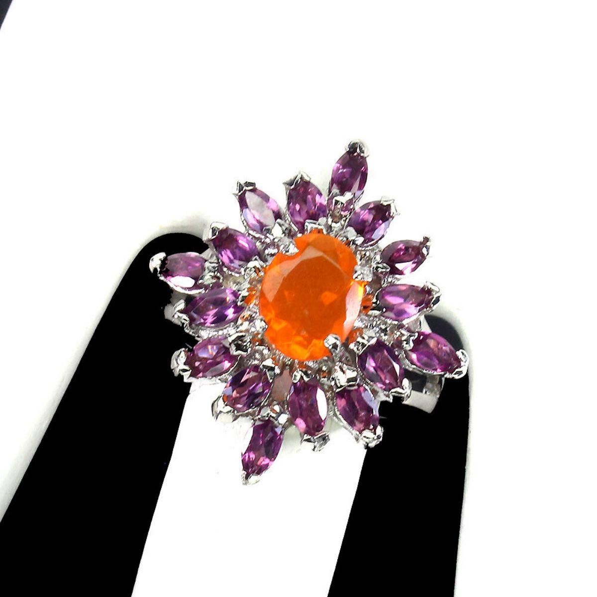 925 STERLING SILVER;PLATE-14K WHITE GOLD;RING SIZE/Resizeable-9;MAIN STONE-ORANGE OPAL;OTHER GEMS-RHODOLITE GARNET;TOTAL WEIGHT-7.09 GRAM (TOTAL WEIGHT OF SILVER + STONE)DIMENSION-* STONE 5.0 X 2.5 TO 9.0 X 7.0 MM.;* RING SIZE- 9.0;* FACE RING- 26.0 X 24.0 MM.;MAIN STONE SHAPE-OVAL CUT;MAIN STONE COLOR-TOP RICH ORANGE;CLARITY/GRADE-IF;TREATMENT-Yes;ORIGIN-MEXICO;HARDNESS-5.5 - 6.5;
