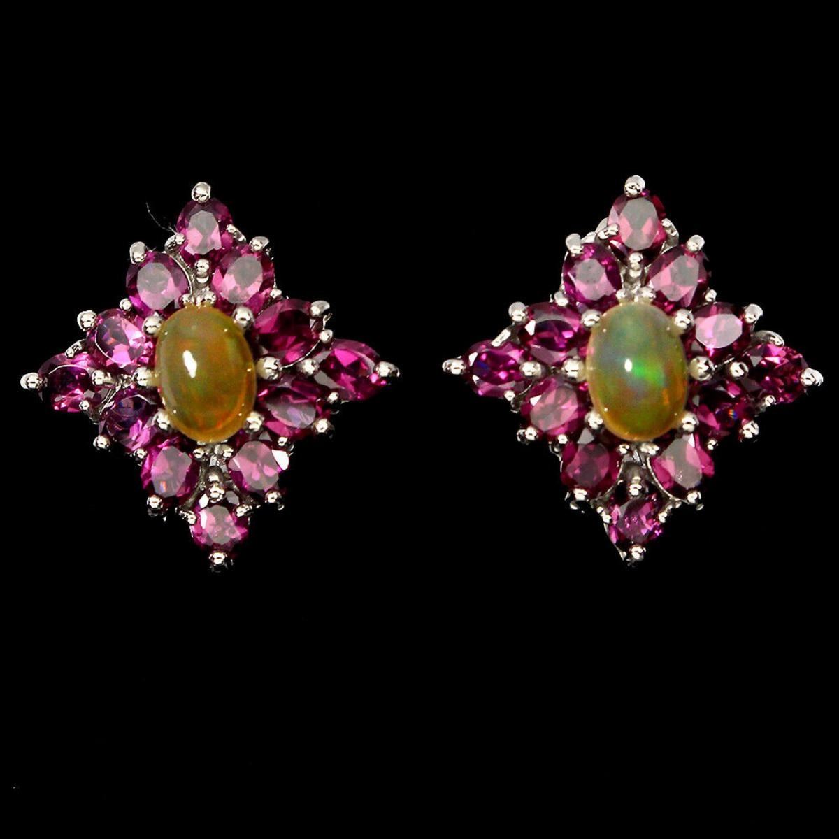 925 STERLING SILVER;PLATE-14K WHITE GOLD;MAIN STONE-FIRE OPAL;OTHER GEMS-RHODOLITE GARNET;TOTAL WEIGHT-7.49 GRAM (TOTAL WEIGHT OF SILVER + STONE)DIMENSION-* STONE 4.0 X 3.0 TO 7.0 X 5.0 MM.;* FACE EARRINGS- 20.0 X 19.0 MM.;MAIN STONE SHAPE-OVAL CABOCHON;MAIN STONE COLOR-White;TREATMENT-UNHEATED;ORIGIN-ETHIOPIA;HARDNESS-5.5 - 6.5;
