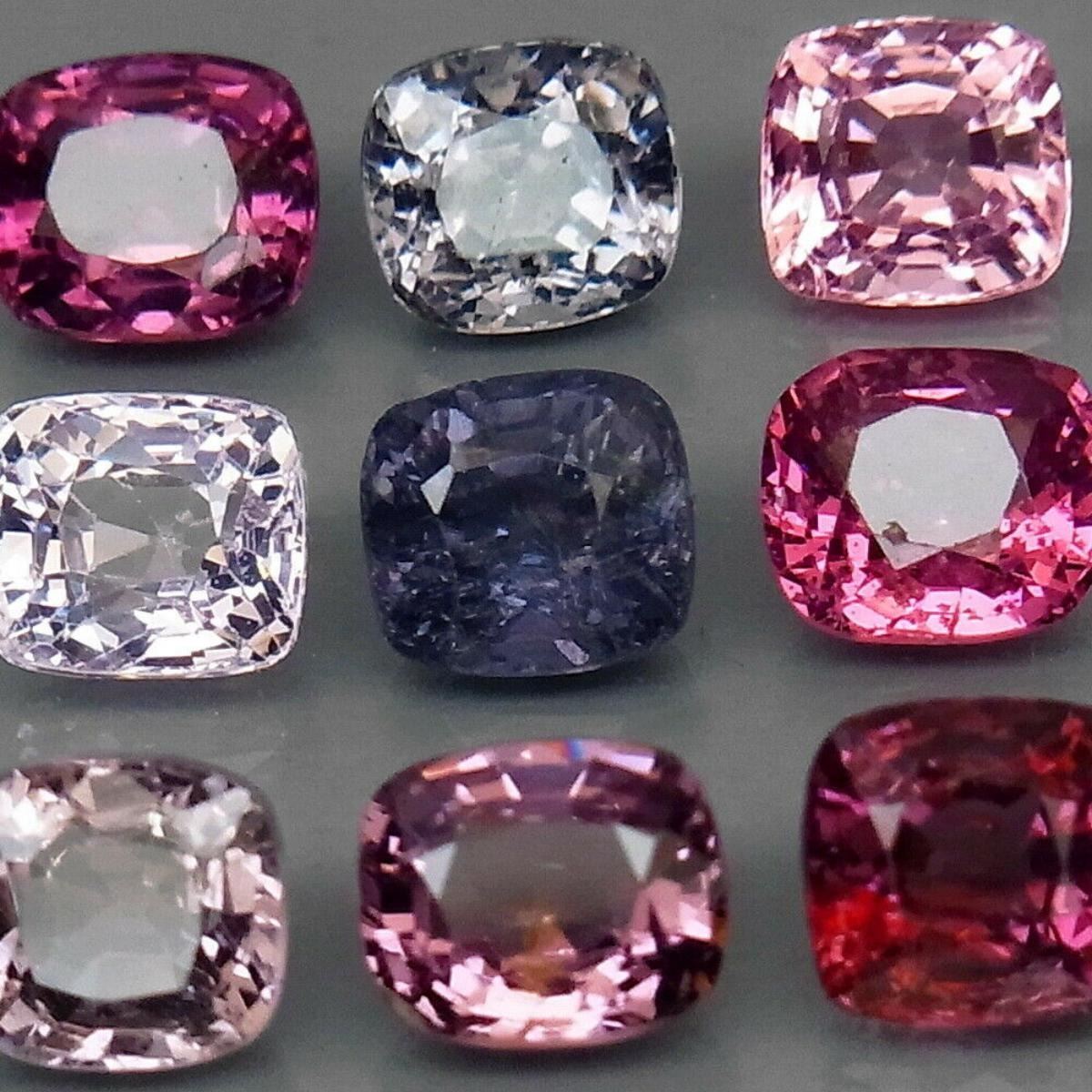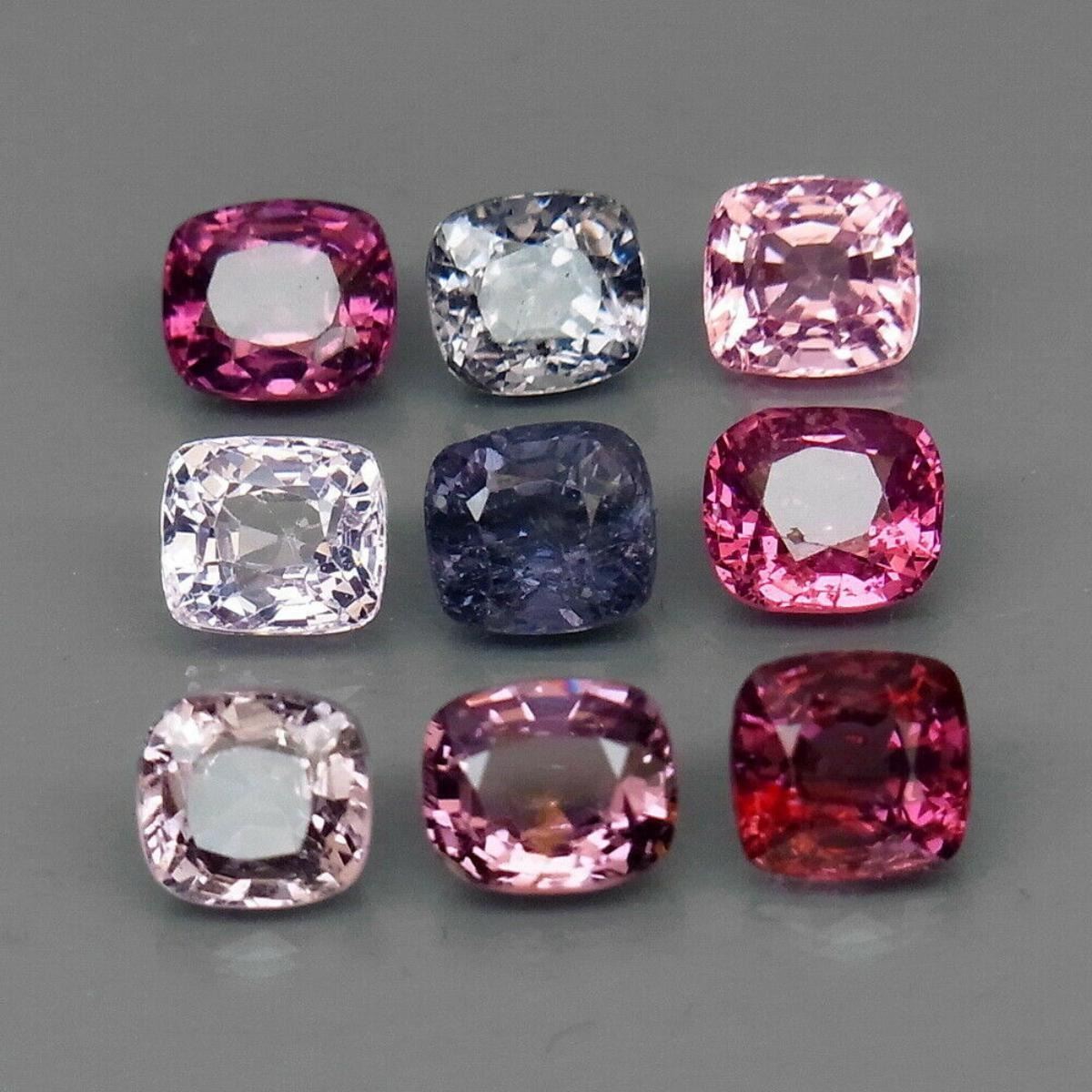 Burma Spinel SHAPE Classic Cushion WEIGHT 7.00 Ct.SIZE 5x5 X to X 6x5 mm ; QUANTITY 9 Pieces COLOR Fancy Color; CLARITY VS; LUSTER Superior ;ORIGIN Burma/ Myanmar;TREATMENT None; HARDNESS 8;