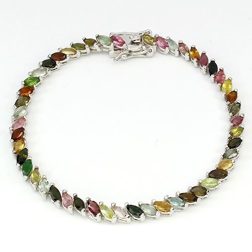 FANCY TOURMALINE (NATURAL) 14K WHITE GOLD COATING 925 SILVER BRACELET;UNIT OF ITEM (S):1 PIECE;WEIGHT (CT.):57.90 CT. (total weight of silver + stone);DIMENSION:* STONE 5.0 X 2.5 MM. * LENGTH 7.0 INCHES.; * FACE BRACELET 176.0 X 4.0 MM.;SHAPE/CUT:MARQUISE FACET;COLOR:TOP FANCY COLORS;CLARITY/GRADE:IF TO VVS TRANSPARENT;LUSTER:FASCINATING;TREATMENT:UNHEATED;ORIGIN:BRAZIL;HARDNESS:7.0 - 7.5