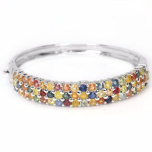 GENUINE MULTI COLOR SAPPHIRE 925 SILVER BANGLE 14K WHITE GOLD COATING; ITEM QUANTITY1STONE SHAPEROUND FACET CUTSTONE DIMENSION3 MM.ITEM WEIGHT23.4 GRAMCOLORMULTI COLORCLARITYVVS - VSLUSTERGORGEOUSTREATMENTHEATEDORIGIN OF STONEAFRICAHARDNESS9.0