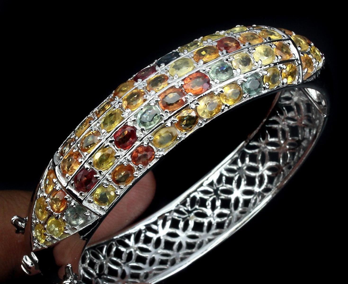 925 STERLING SILVER; PLATE -14K WHITE GOLD; LENGTH (INCHES) 1.9; MAIN STONE SAPPHIRE TOTAL WEIGHT 163.14 CT (TOTAL WEIGHT OF SILVER + STONE) DIMENSION * STONE 4.0 X 3.0 MM. * DIAMETER 1.9 INCHES. * FACE BANGLE 61.0 X 13.0 MM. MAIN STONE SHAPE OVAL CUT MAIN STONE COLOR MULTI-COLOR CLARITY/GRADE IF TO VVS LUSTER RAVISHING TREATMENT HEATED ORIGIN SONGEA - AFRICA HARDNESS 9