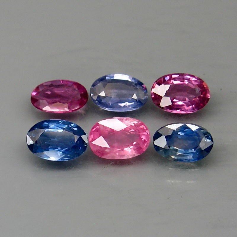 Natural Fancy Color Sapphire 3.46 Ct.....SHAPE :OvalWEIGHT :3.46 Ct.SIZE :6 X 4 Mm.QUANTITY :6 PiecesCOLOR :Fancy ColourCLARITY :Vs SiLUSTER :SuperiorORIGIN :MadagascarTREATMENT :Heated OnlyHARDNESS :9