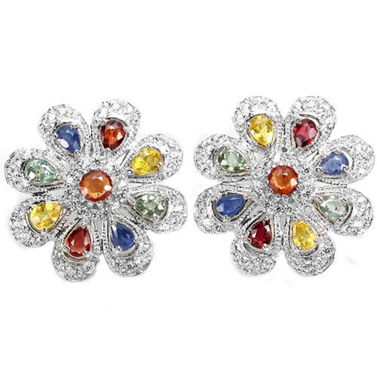 Natural MULTI COLOR SAPPHIRE CZ 925 SILVER EARRING 14K WHITE GOLD COATING;STONE SHAPE -PEAR ROUND FACET CUT; STONE DIMENSION -4 X 3 MM. 4 MM.; ITEM WEIGHT -8.2 GRAM; COLOR -MULTI COLOR; CLARITY -VVS - VS;; LUSTER -DAZZLING; TREATMENT -HEATED; ORIGIN OF STONE -AFRICA; HARDNESS -9.0; FACE OF EARRING -23 X 23 MM. ; WHITE CUBIC ZIRCONIA -1.3 MM.