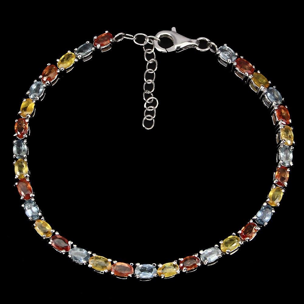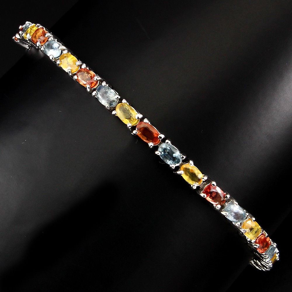 925 STERLING SILVER PLATE 14K WHITE GOLD RING SIZE/LENGTH (INCHES) 8.5 MAIN STONE SAPPHIRE OTHER GEMS TOTAL WEIGHT 57.20 CT (TOTAL WEIGHT OF SILVER + STONE) DIMENSION * STONE 5.0 X 3.0 MM. * FACE BRACELET 160.0 X 3.0 MM. MAIN STONE SHAPE OVAL CUT MAIN STONE COLOR MULTI-COLOR CLARITY/GRADE IF TO VVS LUSTER FASCINATING TREATMENT HEATED ORIGIN SONGEA - AFRICA HARDNESS 9.0