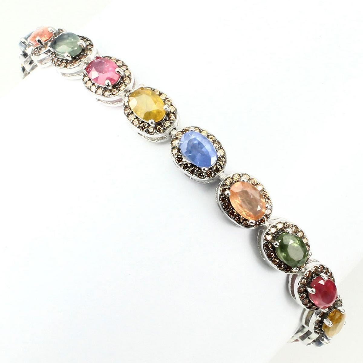 925 STERLING SILVER; PLATE -2-TONE BLACK RHODIUM WHITE 14K GOLD; LENGTH (INCHES)- 8; MAIN STONE -SAPPHIRE; OTHER GEMS -CUBIC ZIRCONIA; TOTAL WEIGHT -73.25 CT (TOTAL WEIGHT OF SILVER + STONE) DIMENSION * STONE 6.0 X 4.0 MM. * CZ 1.0 MM. * FACE BRACELET -190.0 X 7.0 MM.; MAIN STONE SHAPE -OVAL CUT; MAIN STONE COLOR -MULTI-COLOR; TREATMENT -HEATED ;ORIGIN - AFRICA; HARDNESS -9;