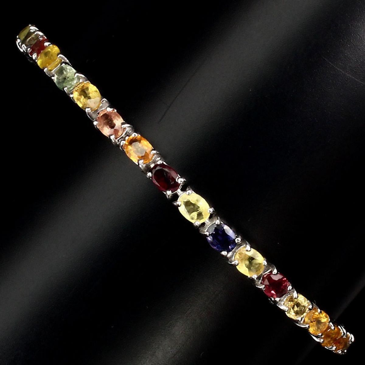 925 STERLING SILVER;PLATE14K WHITE GOLD;/LENGTH (INCHES)7MAIN STONESAPPHIRE;TOTAL WEIGHT40.95 CT (TOTAL WEIGHT OF SILVER + STONE)DIMENSION* STONE 4.0 X 3.0 MM. * FACE BRACELET 171.0 X 3.0 MM.MAIN STONE SHAPEOVAL CUT;MAIN STONE COLORMULTI-COLOR;CLARITY/GRADEIF TO VVS;LUSTERATTRACTIVE;TREATMENTHEATED;ORIGINSONGEA - AFRICA;HARDNESS9;