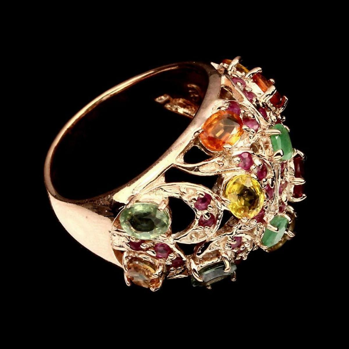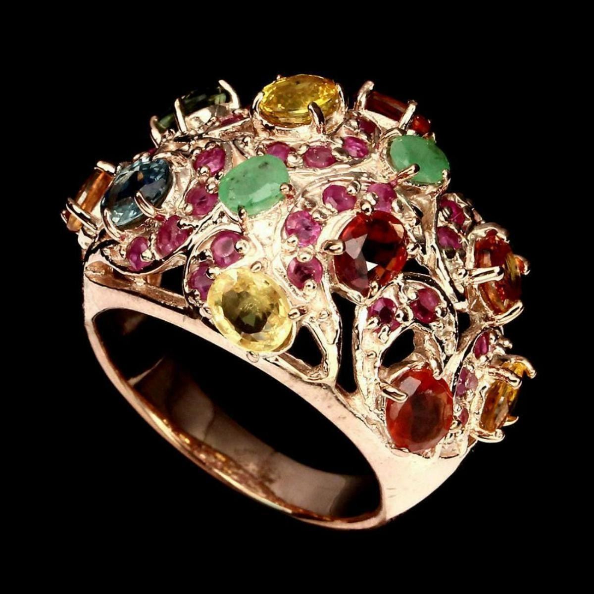 925 STERLING SILVER;PLATE14K ROSE GOLD;RING SIZE9(resizeable)MAIN STONESAPPHIRE;OTHER GEMSEMERALD,RUBY;TOTAL WEIGHT57.55 CT (TOTAL WEIGHT OF SILVER + STONE)DIMENSION* STONE 2.0 TO 5.0 X 4.0 MM. * RING SIZE 9.0 * FACE RING 27.0 X 20.0 MM.;MAIN STONE SHAPEOVAL CUT;MAIN STONE COLORMULTI-COLOR;CLARITY/GRADEIF TO VVS;LUSTERGORGEOUS;ORIGINSONGEA - AFRICA;HARDNESS7.5 - 9.0