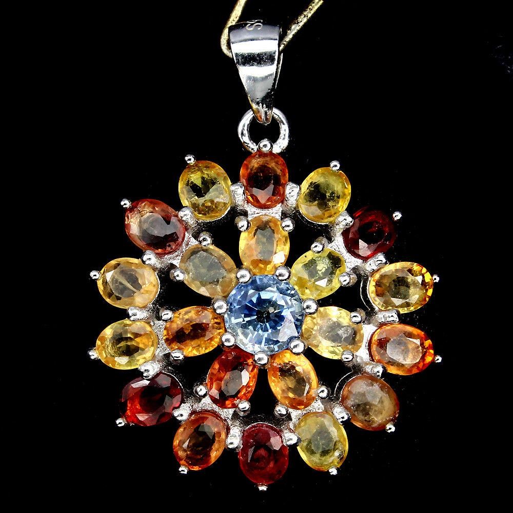 925 STERLING SILVER; PLATE -14K WHITE GOLD; MAIN STONE -SAPPHIRE; TOTAL WEIGHT -18.35 CT (TOTAL WEIGHT OF SILVER + STONE); DIMENSION * STONE 4.0 X 3.0 TO 5.0 MM. * FACE PENDANT 29.0 X 22.0 MM. MAIN STONE SHAPE -ROUND CUT; MAIN STONE COLOR MULTI-COLOR CLARITY/GRADE IF TO VVS LUSTER GRACEFULLY TREATMENT HEATED ORIGIN SONGEA - AFRICA HARDNESS 9