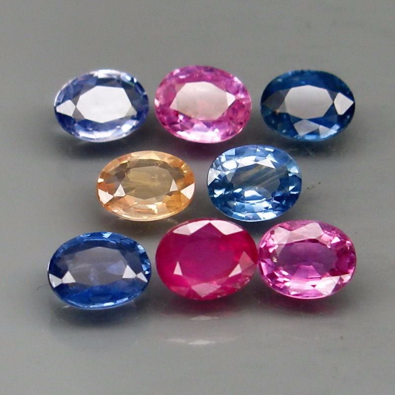Natural SapphireSHAPE :OvalWEIGHT :3.50 Ct.SIZE :5 X 4 Mm.QUANTITY :8 PiecesCOLOR :Fancy ColourCLARITY :Vs SiLUSTER :SuperiorORIGIN :MadagascarTREATMENT :Heated OnlyHARDNESS :9