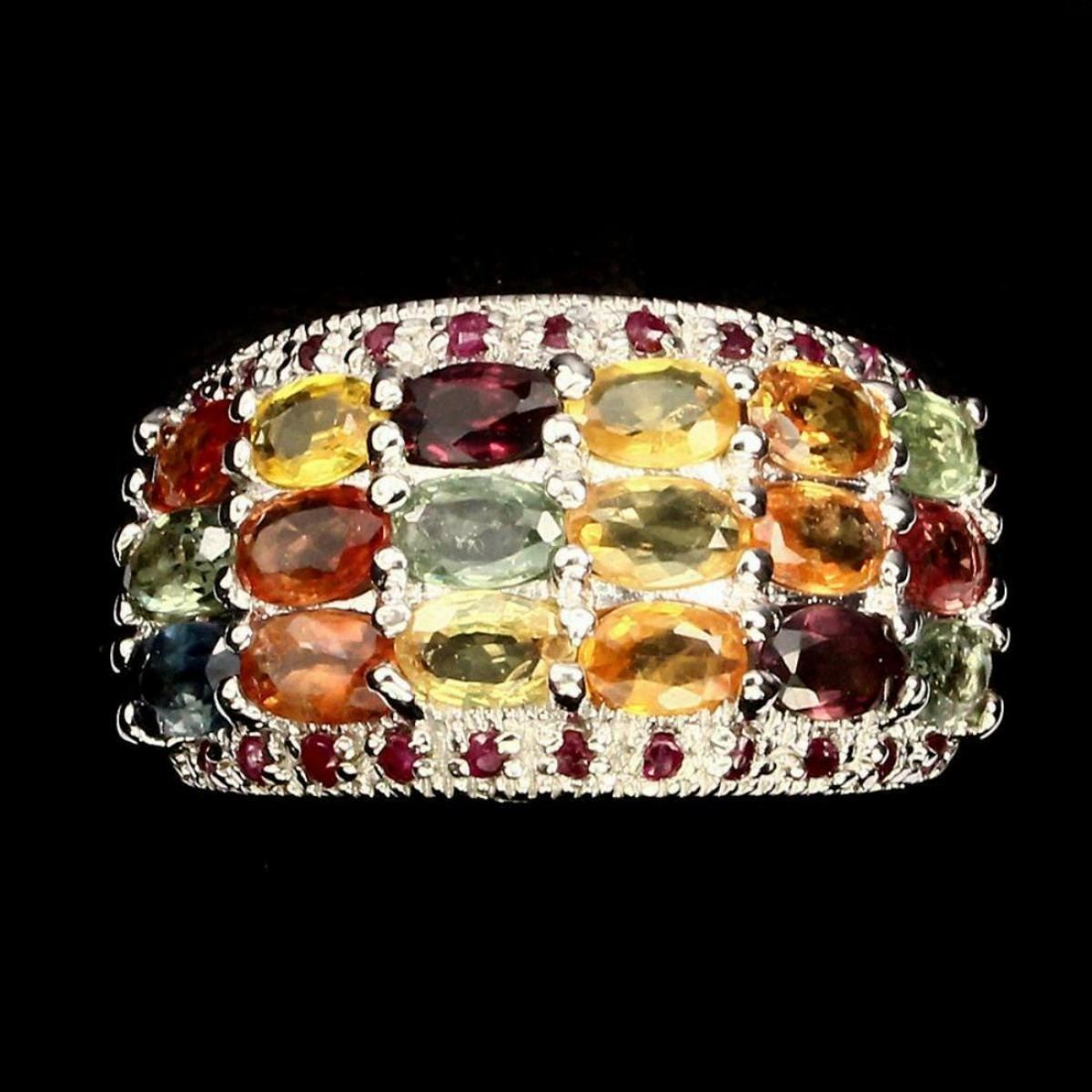 925 STERLING SILVER;PLATE14K WHITE GOLD;RING SIZE..8 Resizable;MAIN STONESAPPHIRE;OTHER GEMS...RUBY;TOTAL WEIGHT49.36 CT (TOTAL WEIGHT OF SILVER + STONE)DIMENSION* STONE 1.5 TO 5.0 X 3.0 MM. * RING SIZE 8.0 * FACE RING 23.0 X 14.0 MM.MAIN STONE SHAPEOVAL CUTMAIN STONE COLORMULTI-COLORCLARITY/GRADEIF TO VVSLUSTERGORGEOUSTREATMENTHEATEDORIGINSONGEA - AFRICAHARDNESS9.0