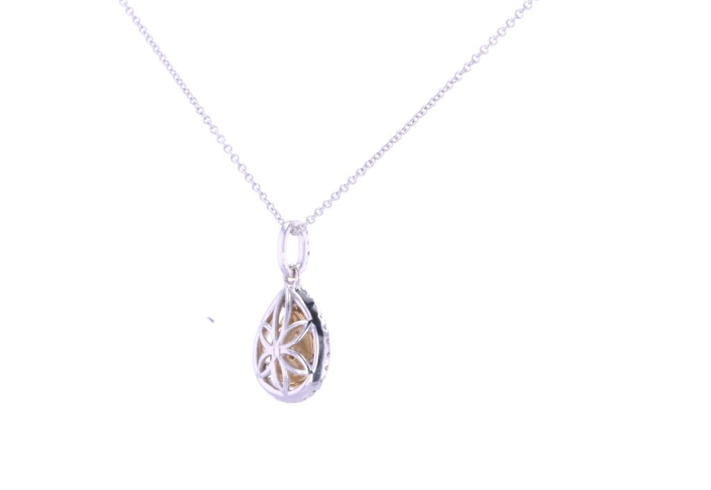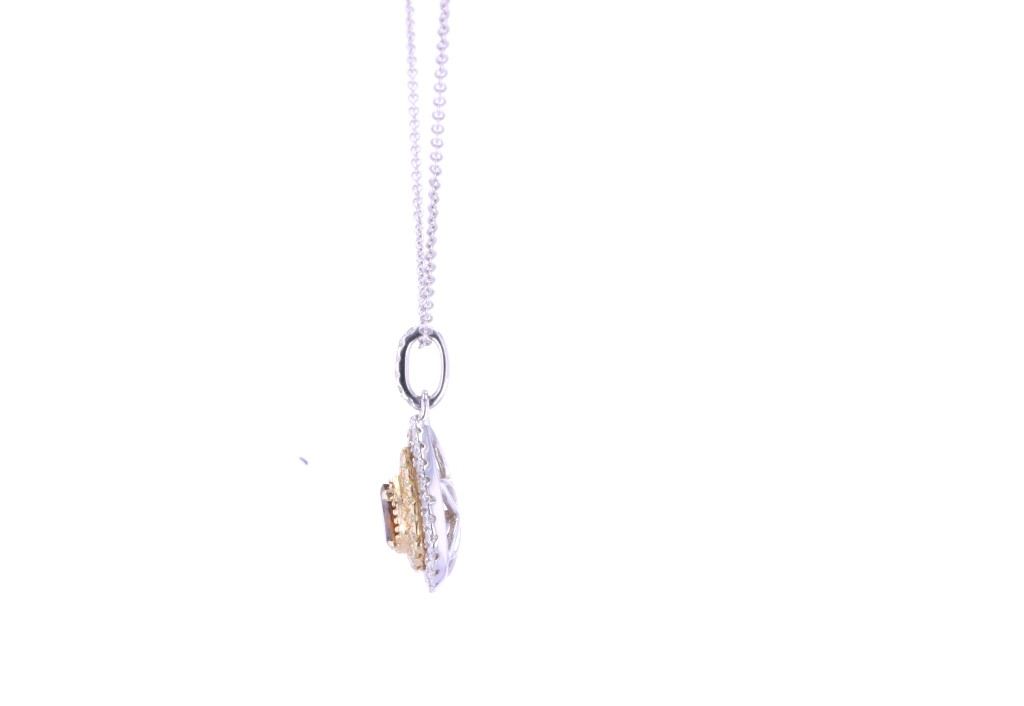 Featured in this lot is this natural fancy colored diamond 14k white gold necklace with AIG and GIA paperwork. The necklace shows a electronically tested 14k white gold ladies cast necklace. The center stone shows a single prong set fancy brownish orangy yellow colored diamond with measurements are 5.20mm x 3.80mm x 2.39mm showing a clarity of I - 1 and shows weight of 0.31ct. The pear shaped center stone is decorated with a pear shape halo ring of seventeen prong set round brilliant cut diamonds measuring approximately 1.30mm-1.30mm x 0.78mm and weighing 0.14ct. The second set of halo ring decorations including a total of 31 prong set round brilliant cut diamonds measuring 1.40 - 1.30 x 0.81mm and showing a weight of .029cts. The piece comes complete with AIG(American International Gemologists, a GIA certified lab AIG Appraisal Number#: 000720246021) report and appraisal confirming the above info and giving a total value of $4,400.00.