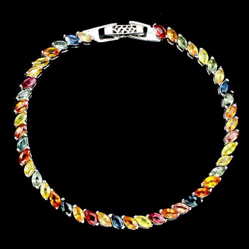 FANCY SAPPHIRE (NATURAL) 14K WHITE GOLD COATING 925 SILVER BRACELETUNIT OF ITEM (S):1 PIECEWEIGHT (CT.):60.18 CT. (total weight of silver + stone)DIMENSION:* STONE 5.0 X 2.5 MM. * LENGTH 7.5 INCHES. * FACE BRACELET 170.0 X 4.0 MM.SHAPE/CUT:MARQUISE FACETCOLOR:TOP FANCY COLORSCLARITY/GRADE:IF TO VVS & TRANSPARENTLUSTER:FASCINATINGTREATMENT:UNHEATED & HEATEDORIGIN:SONGEA - AFRICA & AFRICAHARDNESS:9.0
