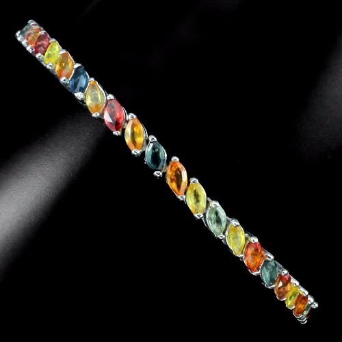 FANCY SAPPHIRE (NATURAL) 14K WHITE GOLD COATING 925 SILVER BRACELETUNIT OF ITEM (S):1 PIECEWEIGHT (CT.):60.18 CT. (total weight of silver + stone)DIMENSION:* STONE 5.0 X 2.5 MM. * LENGTH 7.5 INCHES. * FACE BRACELET 170.0 X 4.0 MM.SHAPE/CUT:MARQUISE FACETCOLOR:TOP FANCY COLORSCLARITY/GRADE:IF TO VVS TRANSPARENTLUSTER:FASCINATINGTREATMENT:UNHEATED HEATEDORIGIN:SONGEA - AFRICA AFRICAHARDNESS:9.0