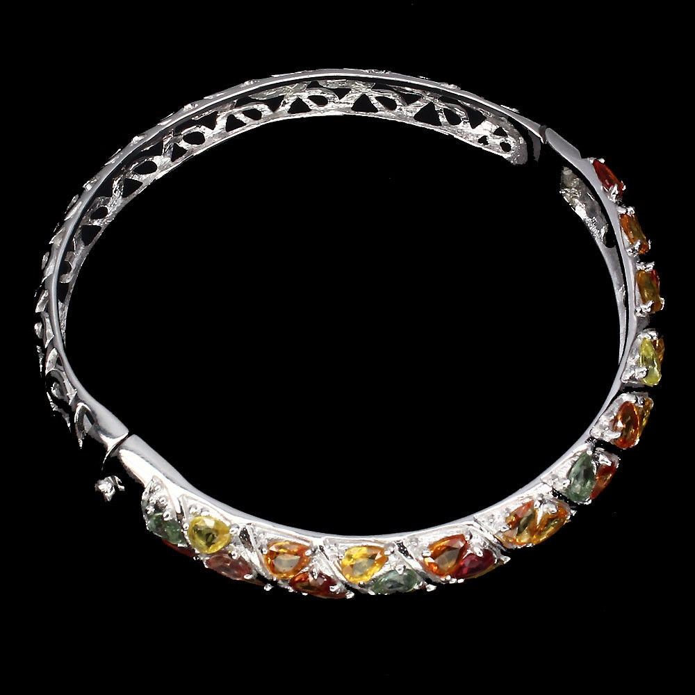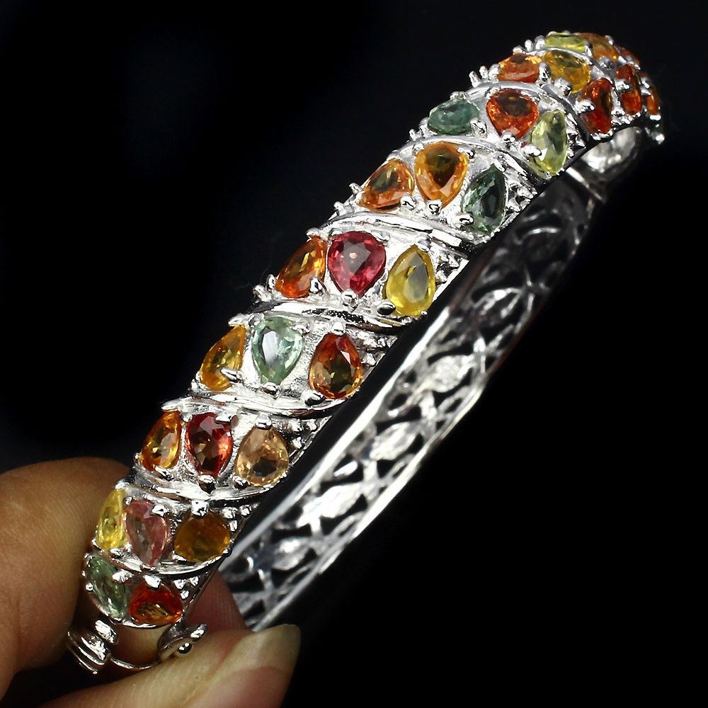925 STERLING SILVER; PLATE -14K WHITE GOLD; MAIN STONE -SAPPHIRE; TOTAL WEIGHT -122.08 CT (TOTAL WEIGHT OF SILVER + STONE) DIMENSION * STONE 5.0 X 4.0 MM. * DIAMETER 2.3 X 2.2 INCHES. * FACE BANGLE 67.0 X 10.0 MM.; MAIN STONE SHAPE -PEAR CUT; MAIN STONE COLOR -MULTI-COLOR; CLARITY/GRADE -IF TO VVS; LUSTER -PRECIOUS; TREATMENT -HEATED; ORIGIN SONGEA - AFRICA; HARDNESS 9.0