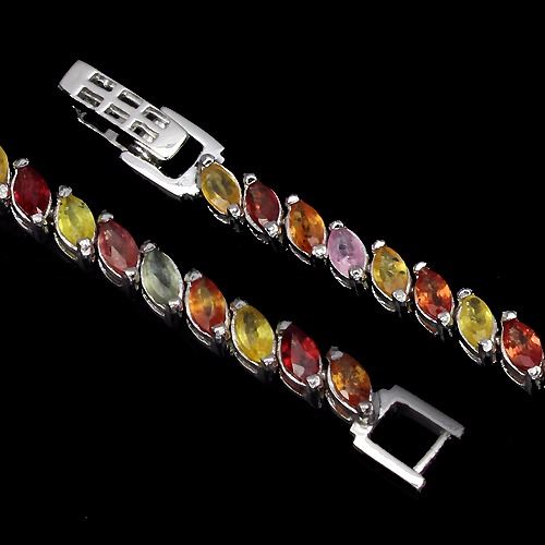FANCY SAPPHIRE (NATURAL) 14K WHITE GOLD COATING 925 SILVER BRACELET;UNIT OF ITEM (S):1 PIECE;WEIGHT (CT.):57.75 CT. (total weight of silver + stone)DIMENSION:* STONE 5.0 X 2.5 MM.* LENGTH 7.5 INCHES. * FACE BRACELET 170.0 X 4.0 MM.SHAPE/CUT:MARQUISE FACET;COLOR:TOP FANCY COLORS;CLARITY/GRADE:TRANSPARENT & IF TO VVS;LUSTER:GORGEOUS;TREATMENT:UNHEATED & HEATED;ORIGIN:SONGEA - AFRICA, TANZANIA - AFRICA ;HARDNESS:9.0