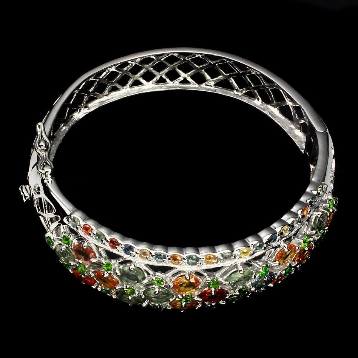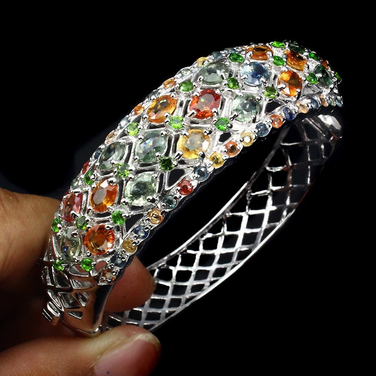 925 STERLING SILVER;PLATE14K WHITE GOLD;MAIN STONESAPPHIREOTHER GEMSCHROME DIOPSIDETOTAL WEIGHT125.10 CT (TOTAL WEIGHT OF SILVER + STONE)DIMENSION* STONE 2.0 TO 5.0 X 4.0 MM. * DIAMETER 2.1 X 2.0 INCHES. * FACE BANGLE 60.0 X 17.0 MM.MAIN STONE SHAPEOVAL CUTMAIN STONE COLORMULTI-COLORCLARITY/GRADEIF TO VVSLUSTERATTRACTIVETREATMENTHEATEDORIGINSONGEA - AFRICAHARDNESS9.0