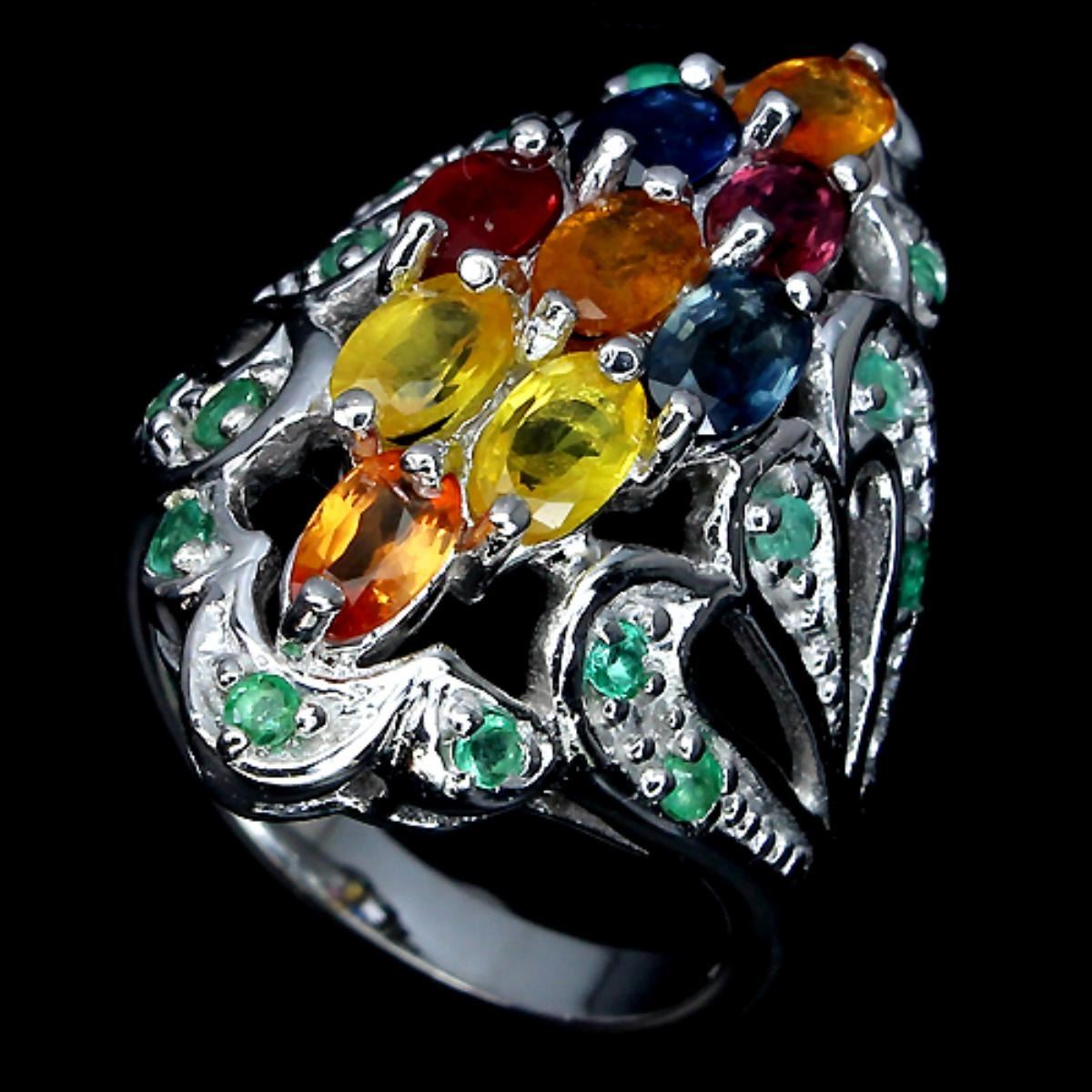 FANCY SAPPHIRE EMERALD (NATURAL) 14K WHITE GOLD COATING 925 SILVER RINGUNIT OF ITEM (S):1 PIECEWEIGHT (CT.):43.08 CT. (total weight of silver + stone)DIMENSION:* STONE 2.0 TO 5.0 X 3.0 MM. * RING SIZE 7.0 * FACE RING 27.0 X 20.0 MM.SHAPE/CUT:OVAL ROUND FACETCOLOR:TOP FANCY COLORSCLARITY/GRADE:TRANSPARENTLUSTER:SUBLIMETREATMENT:HEATED UNHEATEDORIGIN:SONGEA - AFRICA BRAZILHARDNESS:7.5 - 9.0