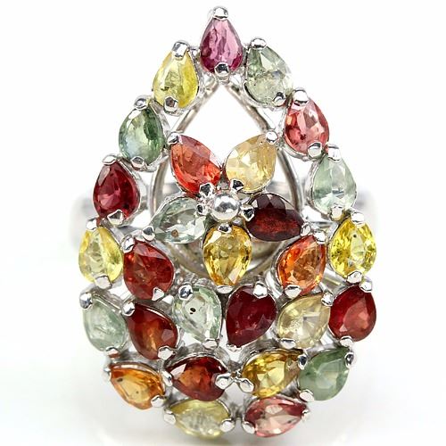 GENUINE SONGEA MULTI COLOR SAPPHIRE 925 SILVER RING 14K WHITE GOLD COATING; RING SIZE -7.50 ;ITEM QUANTITY1STONE SHAPEPEAR FACET CUTSTONE DIMENSION4 X 3 MM.MAIN STONE WEIGHT8.7 CARATCOLORMULTI COLORCLARITYVVS TO VSLUSTERATTRACTIVETREATMENTHEATEDORIGIN OF STONEAFRICAHARDNESS9OTHERFACE OF RING 28 X 19 MM. TOTAL 8.5 G.