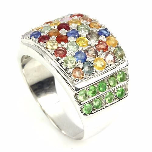 FANCY SAPPHIRE & TSAVORITE GARNET (NATURAL) 14K WHITE GOLD COATING 925 SILVER RING................UNIT OF ITEM (S):1 PIECE;WEIGHT (CT.):44.88 CT. (total weight of silver + stone);DIMENSION:* STONE 2.0 MM. * RING SIZE 10.0 * FACE RING 22.0 X 16.0 MM.;SHAPE/CUT:ROUND FACET & ROUND DIAMOND CUT;COLOR:TOP FANCY COLORS;CLARITY/GRADE:IF TO VVS & TRANSPARENT;LUSTER:GORGEOUS;TREATMENT:HEATED & UNHEATED;ORIGIN:SONGEA - AFRICA, TANZANIA - AFRICA, AFRICA & KENYA - AFRICA;HARDNESS:7.0 - 9.0
