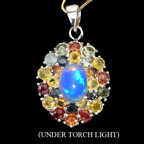 FIRE OPAL FANCY SAPPHIRE (NATURAL) 14K WHITE GOLD COATING 925 SILVER PENDANT;WEIGHT (CT.):19.08 CT. (total weight of silver + stone)DIMENSION:* STONE 2.0 TO 8.0 X 6.0 MM. * FACE PENDANT 26.0 X 15.0 MM.;SHAPE/CUT:OVAL CABOCHON ROUND FACET;COLOR:FANCY COLORS;CLARITY/GRADE:TRANSPARENT IF TO VVS;LUSTER:FABULOUS;TREATMENT:UNHEATED HEATED;ORIGIN:ETHIOPIA, SONGEA - AFRICA ;HARDNESS:5.5 - 9.0