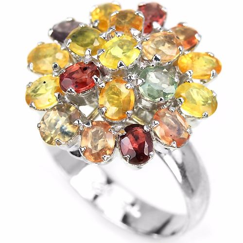 NATURAL FANCY MULTI COLOR SAPPHIRE 925 SILVER RING 14K WHITE GOLD COATING...ring size 8 (can be resized) STONE SHAPEOVAL FACET CUT;STONE DIMENSION4 X 3 MM.;MAIN STONE WEIGHT-4.84 CARAT;COLORMULTI COLOR;CLARITYVVS - VS;LUSTERDAZZLING;TREATMENT-HEATED;ORIGIN OF STONEAFRICA;HARDNESS9.0;OTHERFACE OF RING 19 X 19 MM. ;TOTAL 5.3 G.