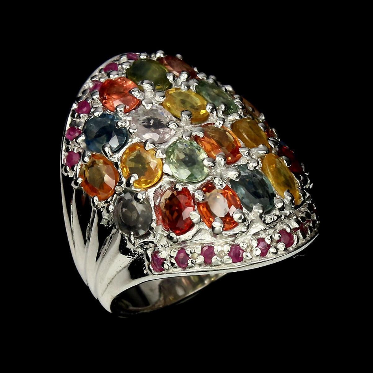 925 STERLING SILVER;PLATE...14K WHITE GOLD;RING SIZE-9(resizeable)MAIN STONE-SAPPHIRE;OTHER GEMS-RUBY;TOTAL WEIGHT-76.74 CT (TOTAL WEIGHT OF SILVER + STONE)DIMENSION* STONE 1.5 TO 5.0 X 4.0 MM. * FACE RING 29.0 X 23.0 MM.;MAIN STONE SHAPEOVAL CUT;MAIN STONE COLORTOP FANCY COLORS;CLARITY/GRADEIF TO VVS;LUSTERGORGEOUS;ORIGIN - AFRICA;HARDNESS-9;